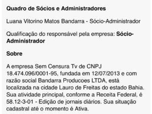 Os prints analisados (Anexos I e II) também trazem um quadro cadastral (QSA) que aponta Luana Vitorino Matos Bandarra como sócia‑administradora da empresa relacionada ao CNPJ citado. Reportagens publicadas anteriormente associam Luana à condição de esposa do vereador Gabriel Bandarra (PL), conhecido como Tenóbio — tema que ganhou repercussão após o rompimento político do parlamentar com a atual gestão municipal e exonerações de comissionados.